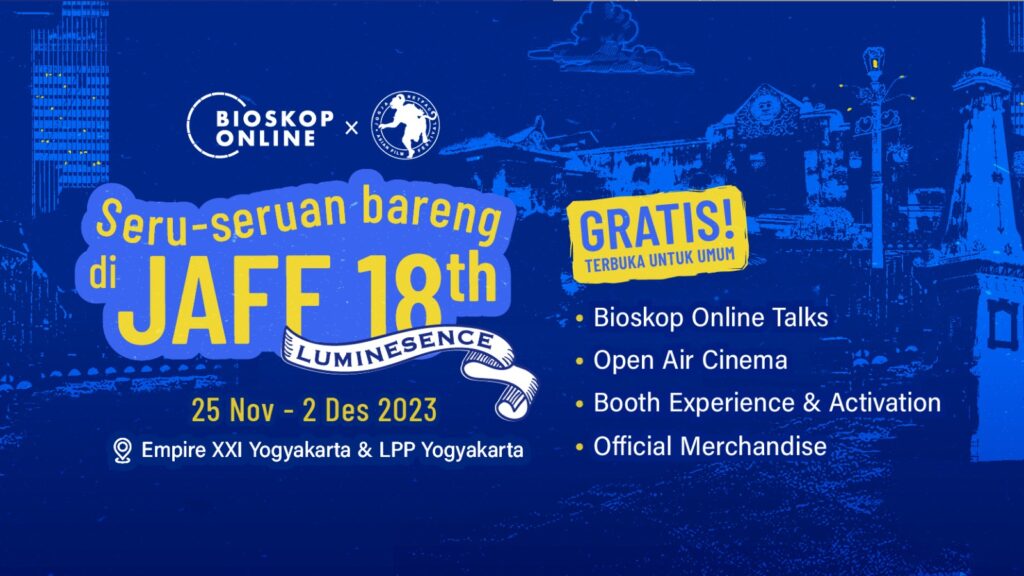 Makassar – Bioskop Online sebagai Rumah Sinema Indonesia, mendukung dan berkolaborasi dalam penyelenggaraan Jogja-NETPAC Asian Film Festival (JAFF) 2023, yang merupakan festival film terbesar di Indonesia. Kolaborasi ini sudah berjalan sejak 17 Agustus 2023 lalu, dengan dirilisnya program 17 Sutradara Perempuan di platform Bioskop Online.
